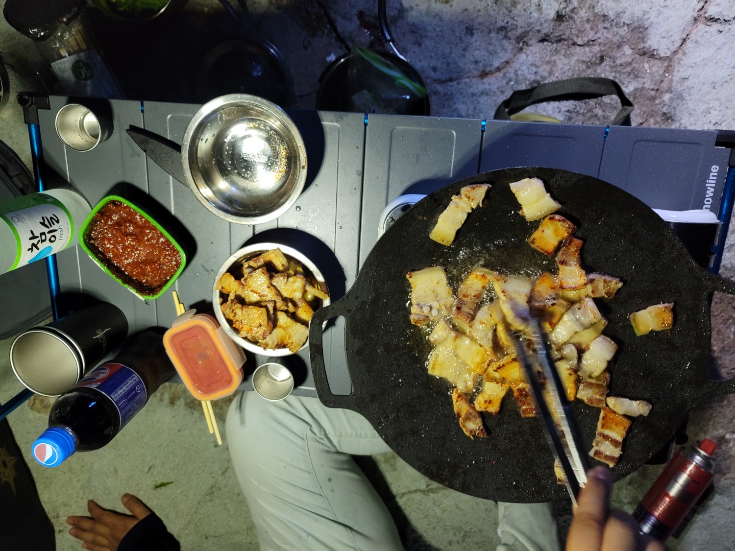 낚시 후 저녁은 우리가 기대했던 삼겹살 파티였습니다. 태양이 지고 서늘한 갯바위에 버너에, 신선한 삼겹살을 구워먹는 것은 우리에게 큰 즐거움이었습니다. 고기가 구워질 때마다 풍기는 육즙 가득한 향기와 함께, 우리는 먹음직스러운 모습을 보이며 즐거운 대화를 이어갔습니다. 자연 속에서의 맛있는 식사는 우리 모두에게 새로운 활력과 만족감을 주었고, 이 순간을 더욱 특별하게 만들어 주었습니다.