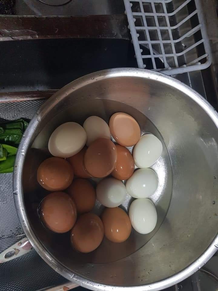 - 껍질을 벗긴 계란을 조심스럽게 넣고, 10분간 조립니다.