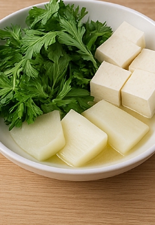 도다리와 무가 익어 국물의 맛이 안정되면 두부와 대파, 다진 마늘을 넣습니다. 쑥은 국을 다 끓인 후 불을 끄기 직전에 넣는 것이 핵심입니다.