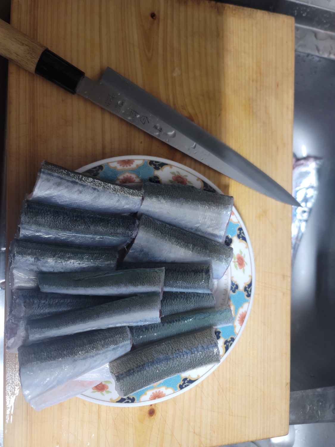 1. 비늘 제거: 동갈치의 비늘을 칼로 긁어내어 제거합니다.