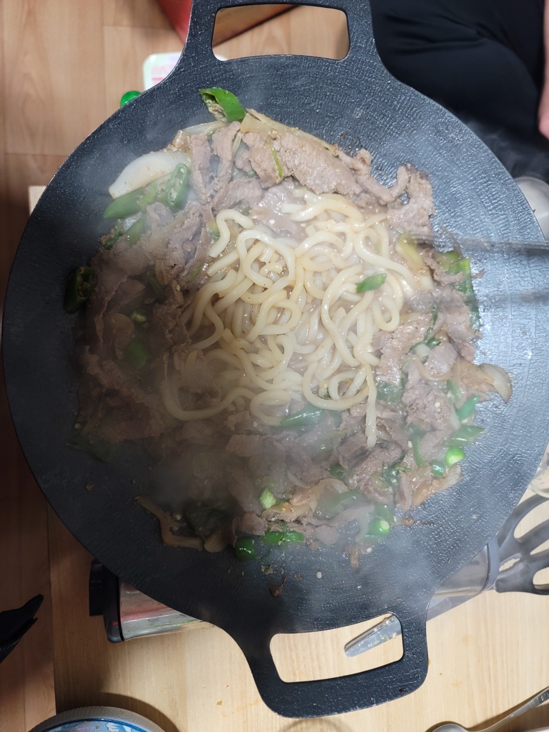 - 우동사리 추가: 쇠고기가 익으면 우동사리를 넣고 같이 볶아준다. 우동사리가 익을 때까지 볶는다.
