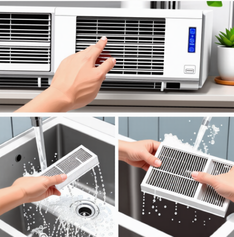 먼저 필터에 쌓인 먼지를 청소기로 빨아들입니다. 그런 다음, 물로 가볍게 씻어낸 후 중성 세제를 사용해 부드럽게 문지르면서 청소합니다. 세척 후에는 물기를 완전히 제거한 후 건조시킵니다.