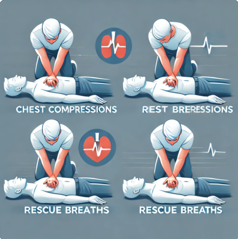 심정지가 발생하면 즉시 심폐소생술(CPR)을 시행해야 합니다. CPR은 심장이 멈췄을 때 혈액을 순환시키고 산소를 공급하기 위해 필요한 중요한 응급처치입니다. 다음은 CPR의 기본 단계입니다: