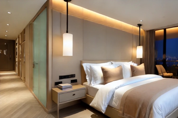 호텔 침실의 색상은 주로 차분하고 중성적인 색조를 사용합니다. 화이트, 베이지, 그레이 등 세련된 색상 조합이 좋으며, 패브릭은 벨벳, 린넨처럼 고급스러운 질감의 소재를 선택하세요. 컬러 조합이 일관되면 방 전체가 조화롭게 느껴집니다. 커튼이나 카펫, 쿠션과 같은 소품의 색상을 통일해주면 호텔의 감각을 더욱 강조할 수 있습니다.